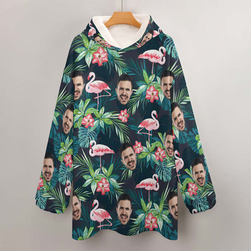 Custom Face Adult Unisex Blanket Hoodie Personalized Blanket Pajama Gift Hawaiian Flamingos