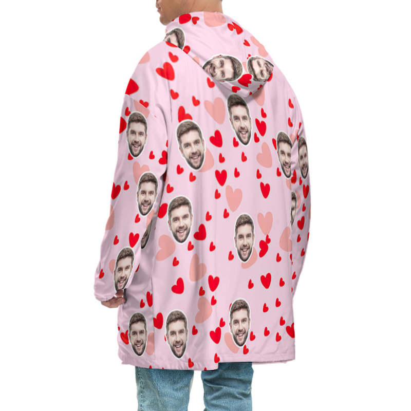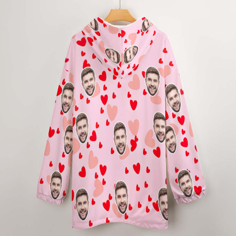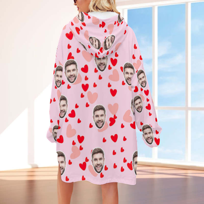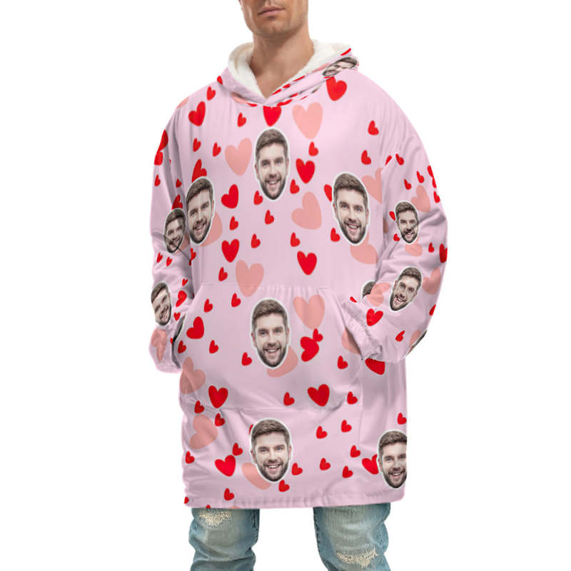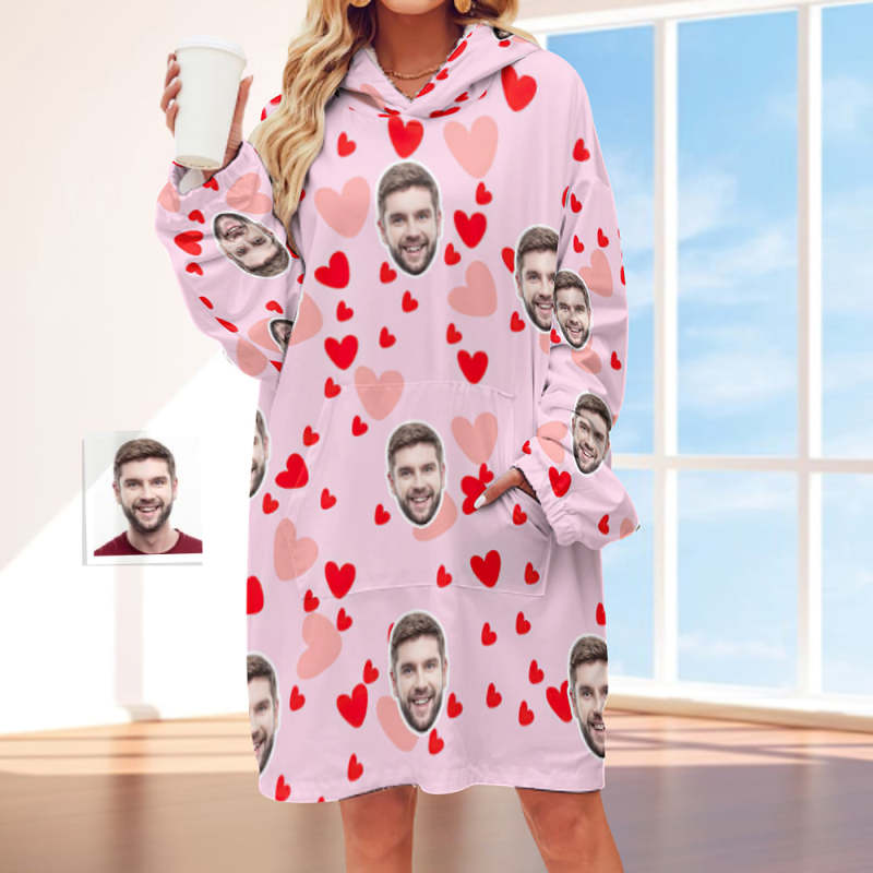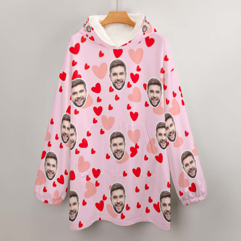 Custom Face Adult Unisex Blanket Hoodie Personalized Blanket Pajama Gift Pink Heart