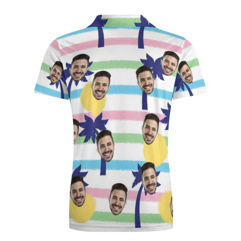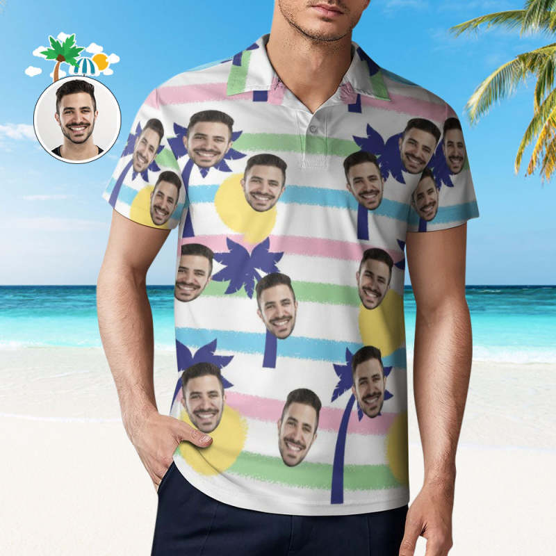Custom Face Blue Palm Tree Polo Shirt For Men Personalized Hawaiian Golf Shirts