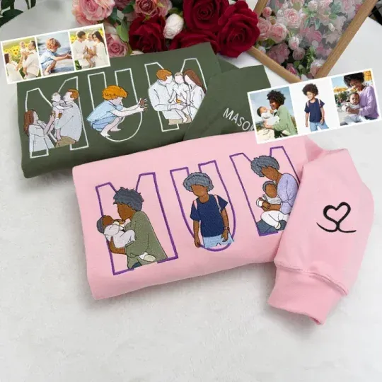 Custom Family Portrait Embroidered Sweatshirt – A Special Gift for Mum and Mama Featuring Kids' Names on Sleeves