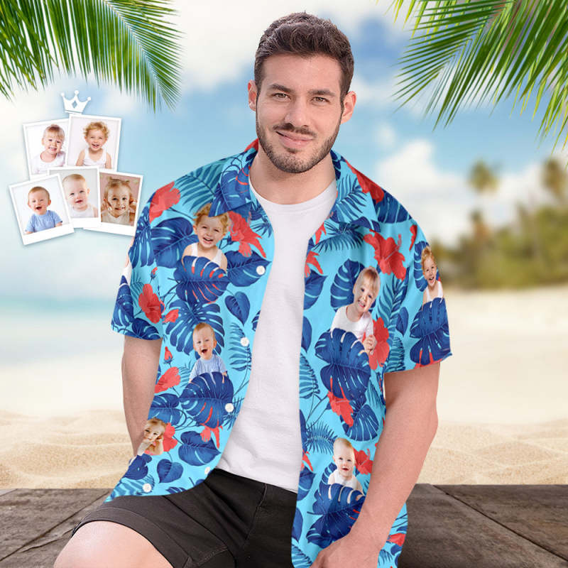Custom Kids Face Hawaiian Shirt Personalized Tropical Blue Shirts Men's All Over Print Hawaiian Shirt for Dad