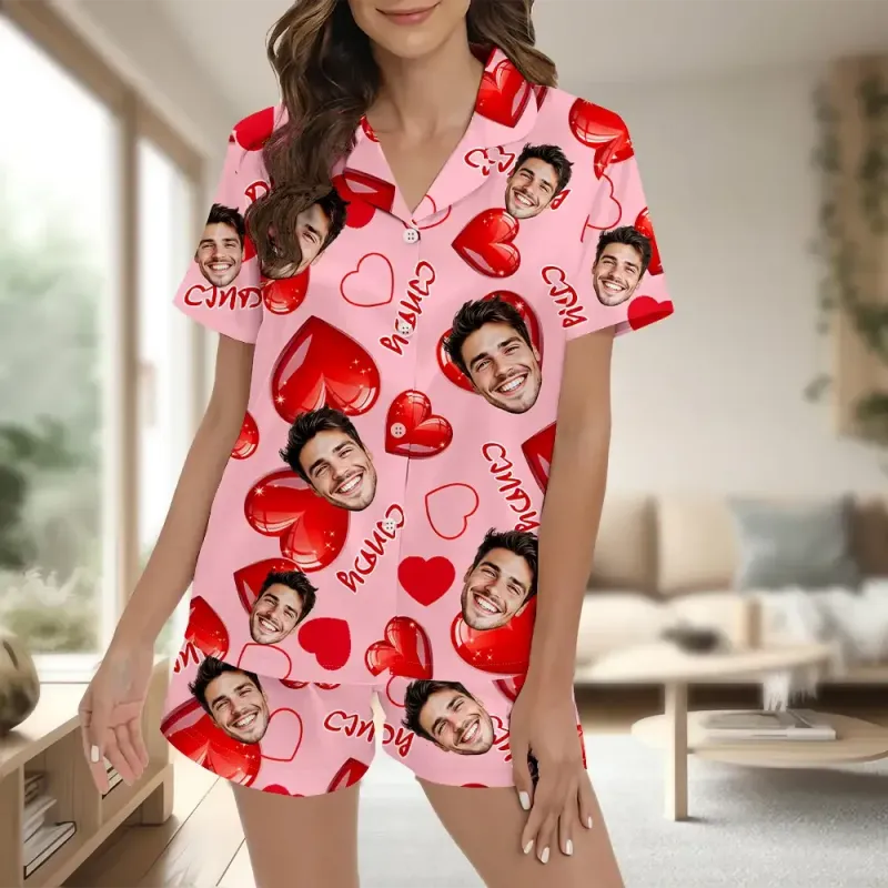 Custom Short Sleeve Pajama Bright Pink Base with 3D Red Hearts and Lips Prints Valentine's Day Gift for Her