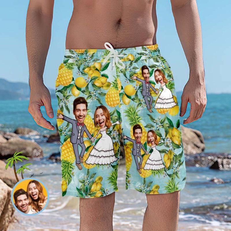 Custom Wedding Beach Shorts Funny Pineapple Couple Face Swim Trunks