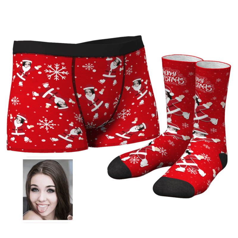 Men's Snowflake Boxers Face on Santa Claus's Body And Crew Socks Set